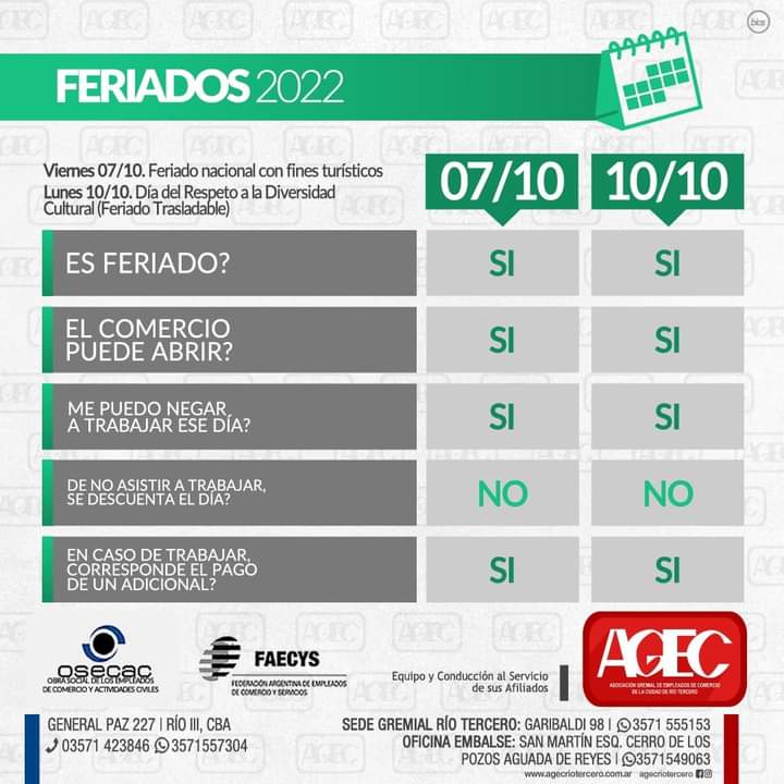 Así se expresó con relación al feriado de este fin de semana el secretario general de AGEC, José "Pepe" Orlandi, quien señaló "es feriado nacional, hay que acatar las leyes, más allá de que entiendo a los comerciantes y al Centro Comercial con lo que proponen", agregando que si los empleados trabajan deben percibir el día al 100 por ciento. También señaló que realizarán controles al azar junto al Ministerio de Trabajo los días viernes y lunes.