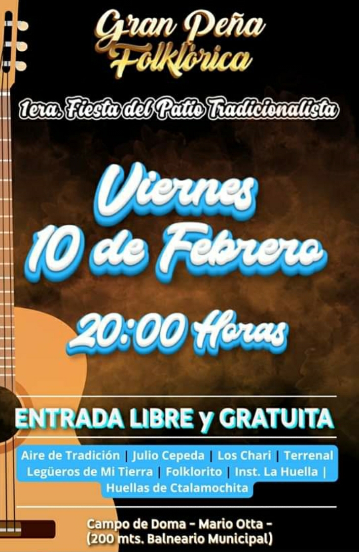 Hablamos al respecto con el presidente del Centro Tradicionalista, Andrés Acuña, quien señaló: "Arrancamos el 2023 con una peña a nivel local y estamos con mucha expectativa". El evento se realizará este viernes a partir de las 20 en el Campo de Doma "Mario Otta" a partir de las 20, y la grilla de artistas comenzará a desfilar por el escenario a partir de las 22 horas.