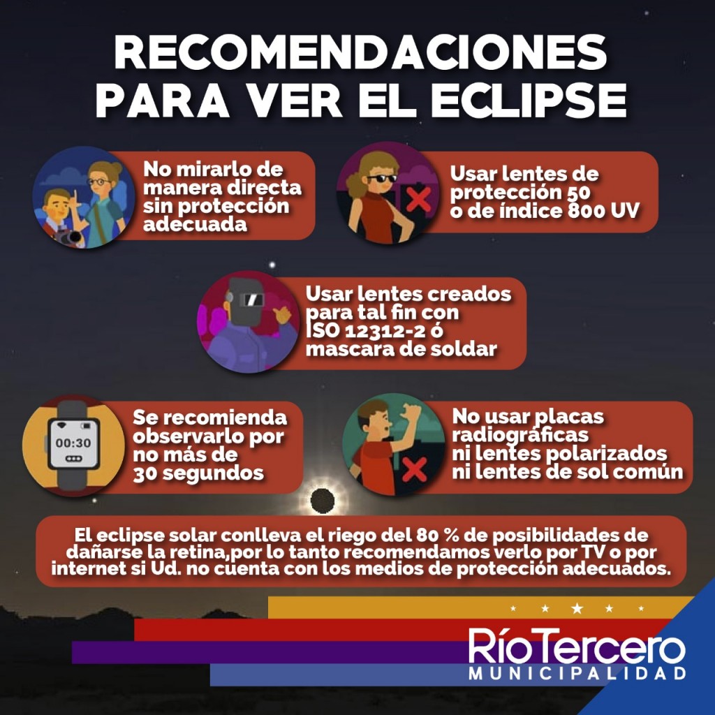 El próximo martes 2 de julio de 2019 se producirá un eclipse de sol que será visible en gran parte de nuestro territorio. Nuestra ciudad está dentro de la franja donde se verá este fenómeno. RECOMENDACION: se solicita a toda la población no mirar el eclipse directamente por los daños que puede causar en la vista.
