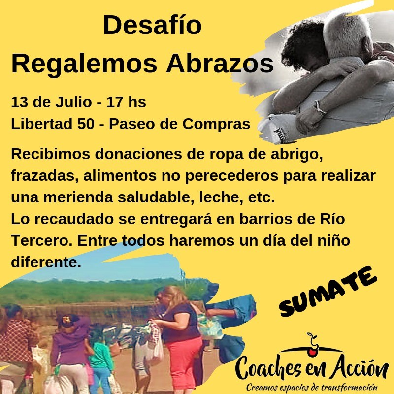 Diálogamos con Mónica Ciacci (Integrante de Coaches en Acción) quienes este Sábado 13 en el Paseo Centro de Compras a las 17 hs van a llevar a cabo un Desafió "Regalemos Abrazos" con un doble objetivo una colecta Solidaria de merienda saludable y de regalar un Abrazo a quienes lo necesiten.