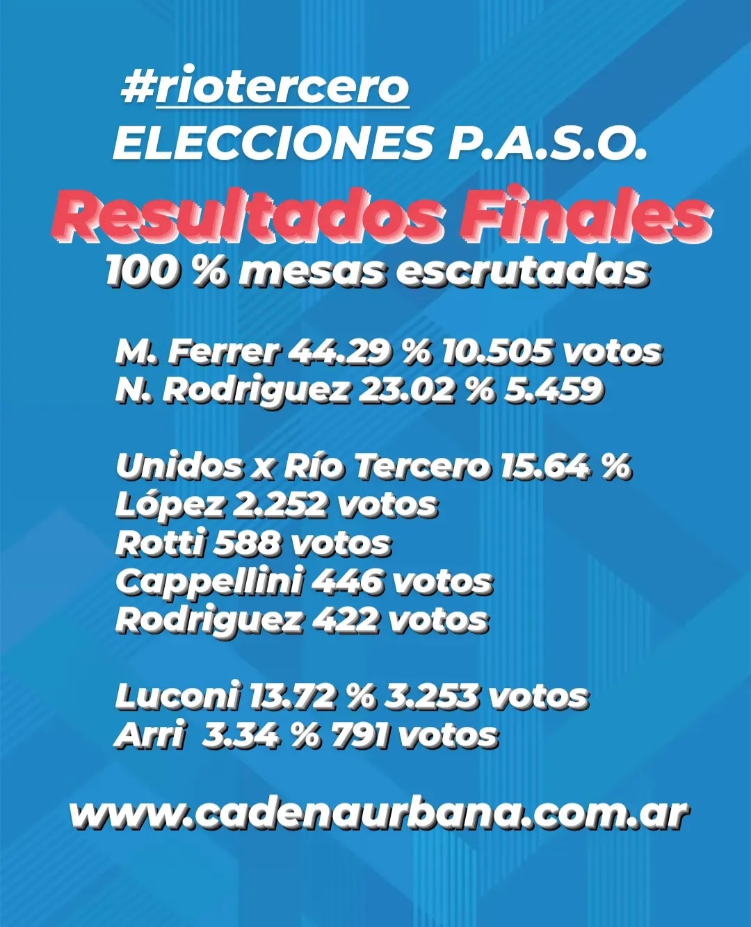 Elecciones P.A.S.O. en Río Tercero, aquí los resultados finales con el 100 % de las mesas escrutadas.