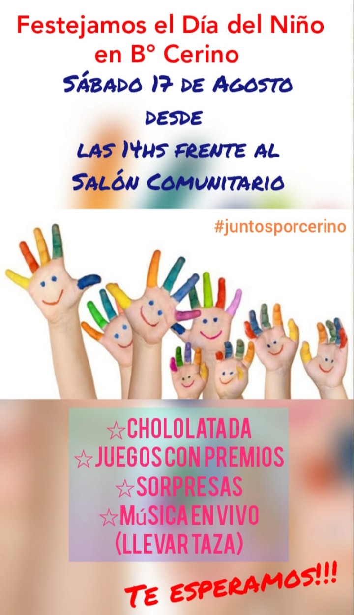 La comisión vecinal de Barrio Cerino festeja hoy Sábado desde las 14hs la fiesta día del niño, con juegos, cantantes solistas, chocolatada y sorpresas para todos los niños. Es el primer festejo de la nueva comisión que asumió en diciembre del 2018.