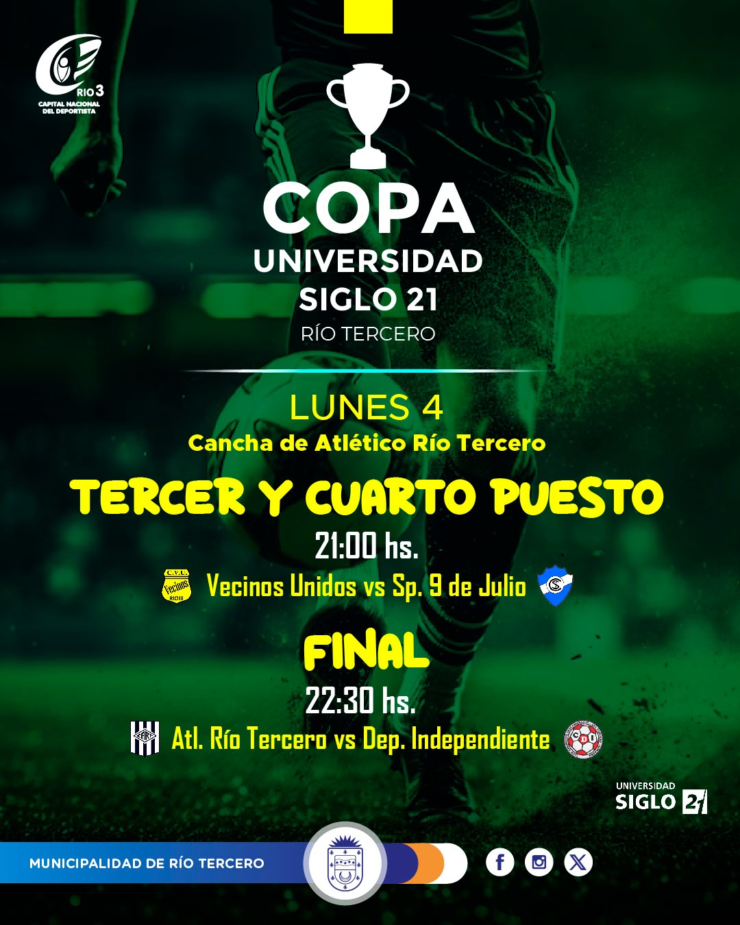 �?‘? Esta noche se juega la final de la �?�? Copa Universidad Siglo 21 - Río Tercero y te contamos cuáles son los partidos que vas a poder ver. Recordá que todos serán en la cancha de Club Atlético Río Tercero.