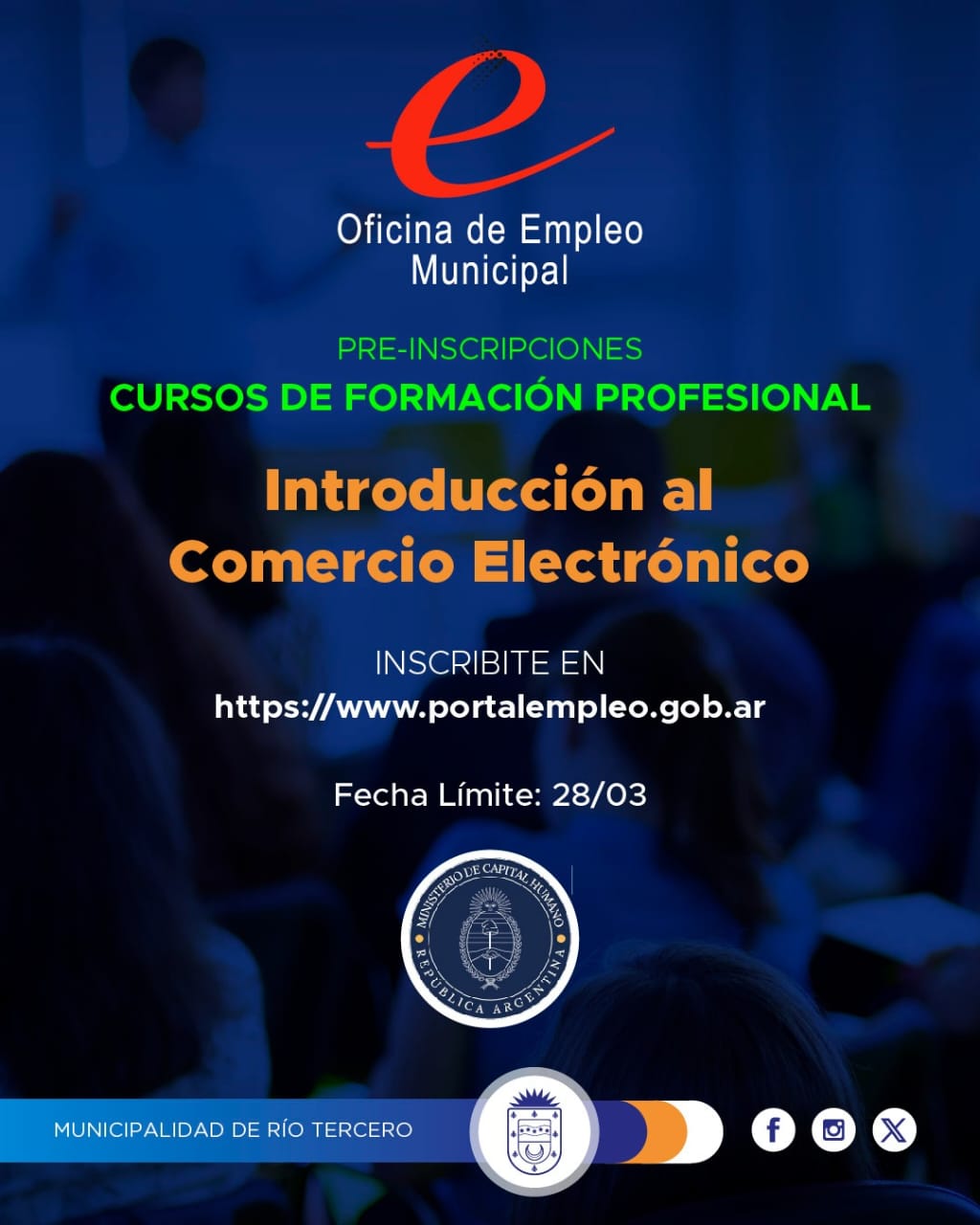 🔹 Destinado a: Beneficiarios del Programa Fomentar FTE prioridad I, Fomentar FTE prioridad ll, otros programas y personas desocupadas. ▶️ Primero hay ingresar a www.portalempleo.gob.ar y preinscribirse, recomendamos a los y las interesados/as filtrar por localización (Córdoba) y modalidad (Distancia auto asistida). Fecha final para la pre inscripción: 28/03.‼️ En los primeros días del mes de abril les llegará la confirmación de si quedaron inscriptos al curso que se anotaron, recuerden siempre revisar su mail y la bandeja de correos no deseados o spam. También pueden ingresar al portal con su CUIL tanto en usuario y contraseña o con su usuario y clave si es que ya habían realizado otros cursos en formar.gob.ar. ✅ 👉 Para más información y asesoramiento pueden contactarse vía mensajes de WhatsApp (3571-679906) o acercarse a la Oficina de Empleo Municipal, de 07:00 🕖 a 13:00 hs. 🕐 #EmpleoRío3