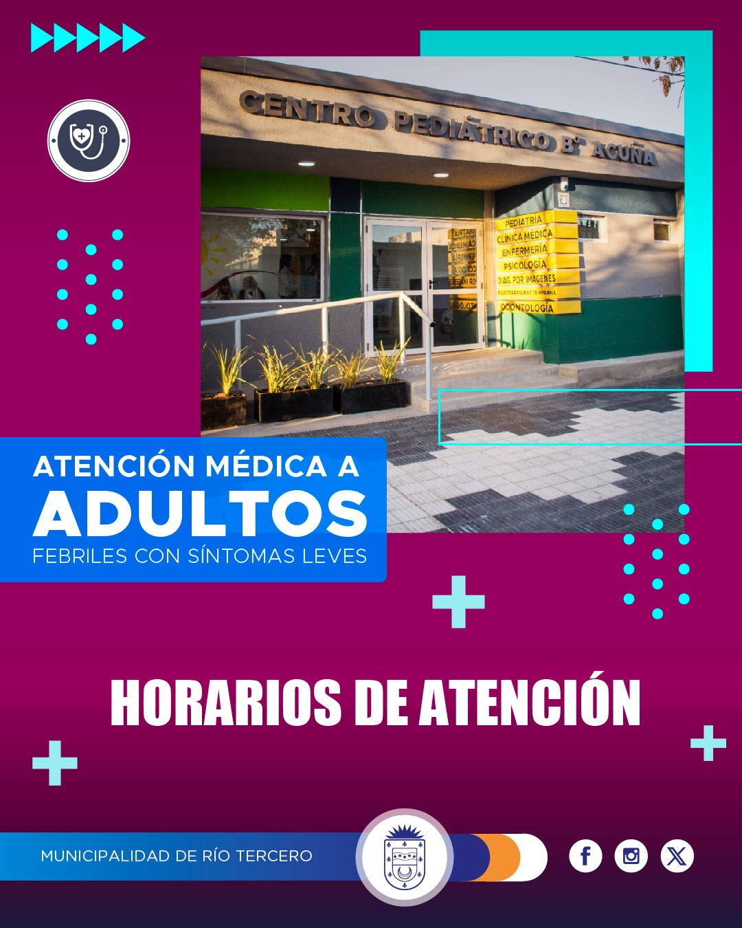 Debido a la situación sanitaria actual con el Dengue, solicitamos a todos los pacientes febriles sin síntomas graves (vómitos persistentes, dolor abdominal intenso y/o signos de sangrado) que acudan al Centro Pediátrico de Barrio Acuña para una evaluación clínica en los siguientes días y horarios: