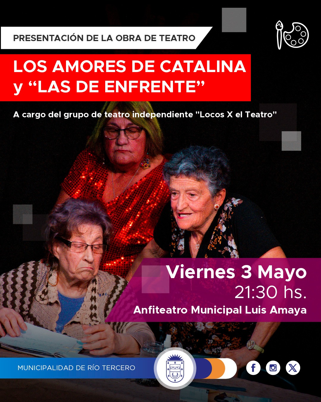 Este viernes 3 a partir de las 🕤 21:30 hs en el Anfiteatro Municipal el grupo de teatro independiente "Locos X El Teatro" 🎭 presentará sus obras de comedia "Los Amores de Catalina" y "Las De Enfrente". 😁