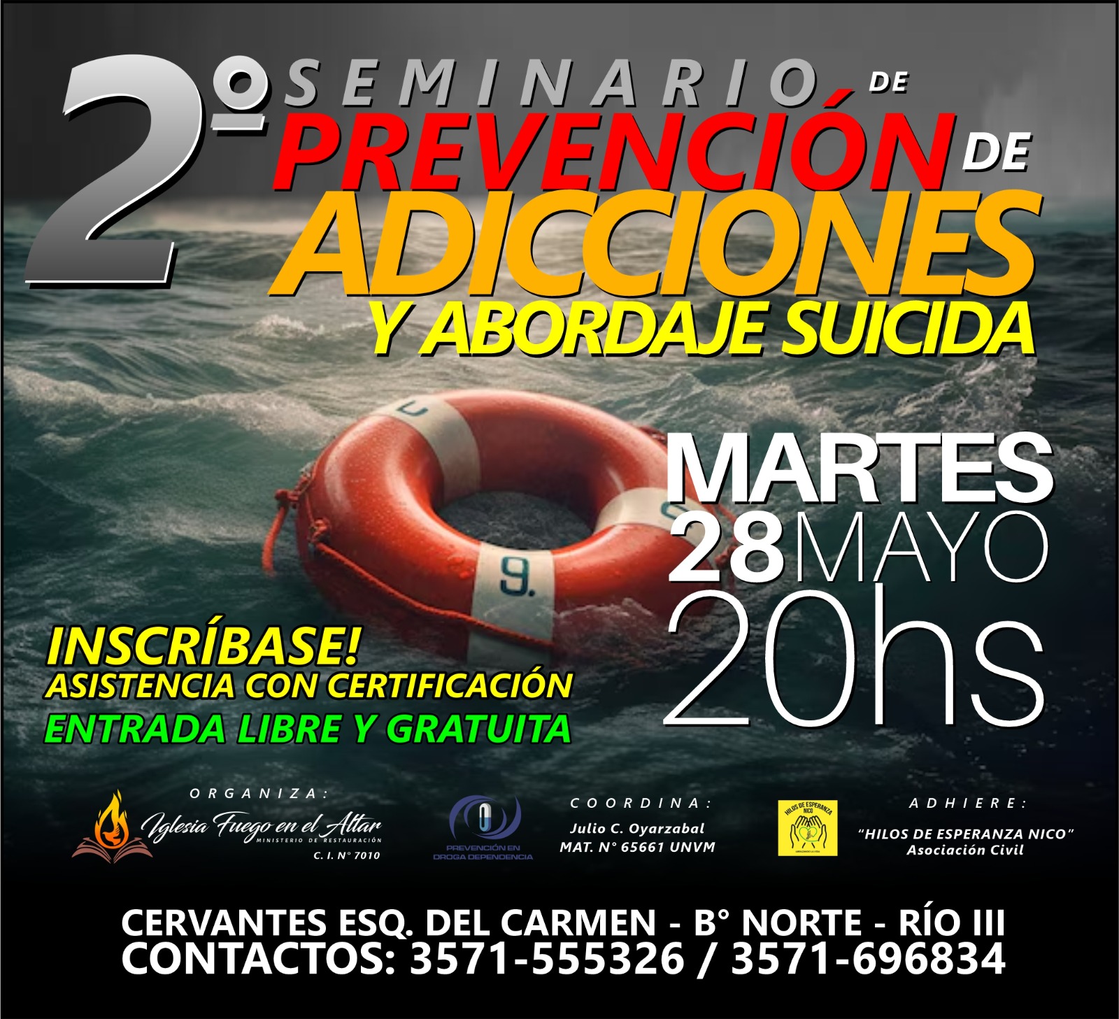 Así se expresó el pastor de lglesia "Fuego en el Altar", donde se estará realizando el Segundo Seminario de Prevención de Adicciones y Abordaje Suicida. El evento responde "fundamentalmente a lo que nos toca de cerca a muchos en la ciudad, brindando herramientas y luz ante las Adicciones y un tema fundamental como el abordaje suicida", expresó Vistica quien además detalló los temas de los cuatro módulos con que contará el seminario. El evento se realizará el próximo 28 de mayo a partir de las 20 en la Iglesia "Fuego en el altar", ubicada en Del Carmen y Cervantes de barrio Norte, y es abierto a todo público.