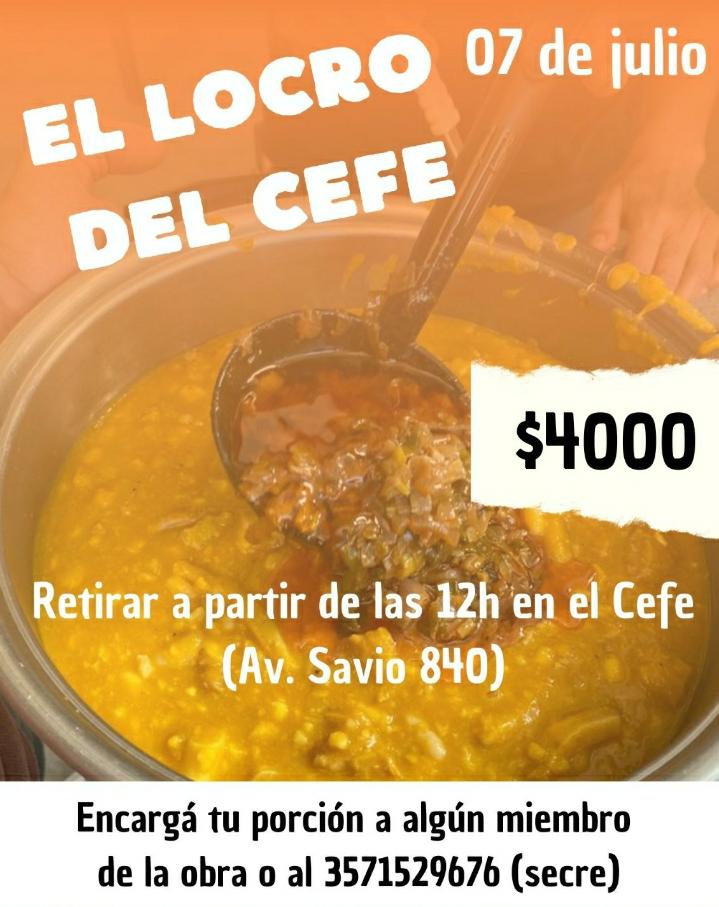 Así se expresó la Coordinadora del Centro Juvenil Salesiano "Ceferino Namuncurá" acerca del gran locro que estarán realizando este domingo 7 de julio, con un costo de 4000 pesos la porción. "Todos saben que estos eventos se hacen para colaborar con los niños y jóvenes que asisten al Cefe" y también para solventar las actividades de los oratorio de los barrios Parque Montegrande y Magnasco. Las porciones de locro podrán ser retiradas el domingo entre las 12 y las 13 30 ingresando por portón que está ubicado sobre Avenida Savio.