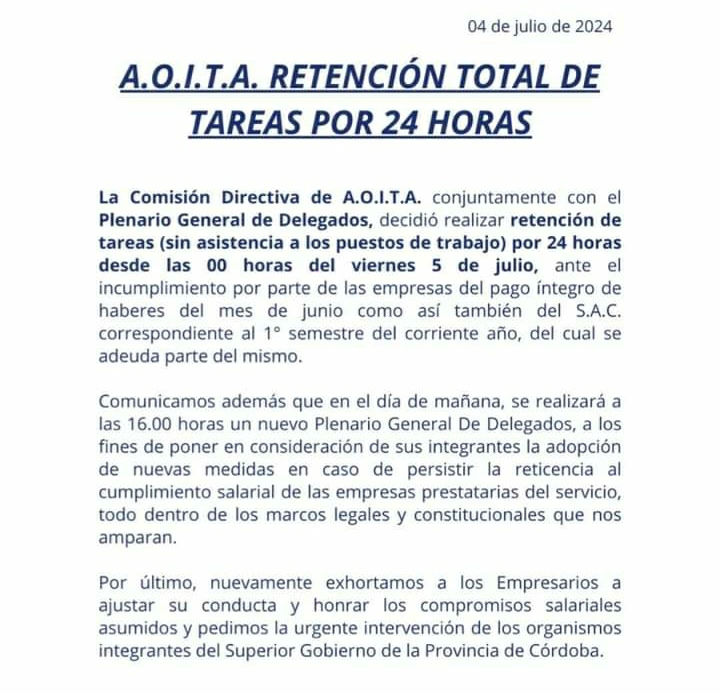 Claudio Luna, representante del gremio, confirmó, en diálogo con Cadena 3, que la medida se resolvió tras el anuncio de los empresarios en la Secretaría de Trabajo, quienes mencionaron que no cuentan con los fondos para completar el pago de los salarios y el saldo del 1°SAC del período de junio y esperan asistencia de la provincia.