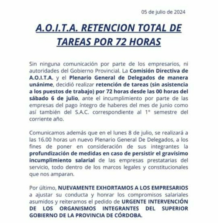 Aoita, el gremio de los choferes del transporte interurbano de Córdoba, extiende el paro de transporte interurbanos. La extensión por 72 horas comienza desde las 0 del sábado y concluirá el lunes a las 23:59. La retención de tareas es en reclamo por la falta de pago de los salarios de junio y del medio aguinaldo en la mayoría de las empresas del sector.