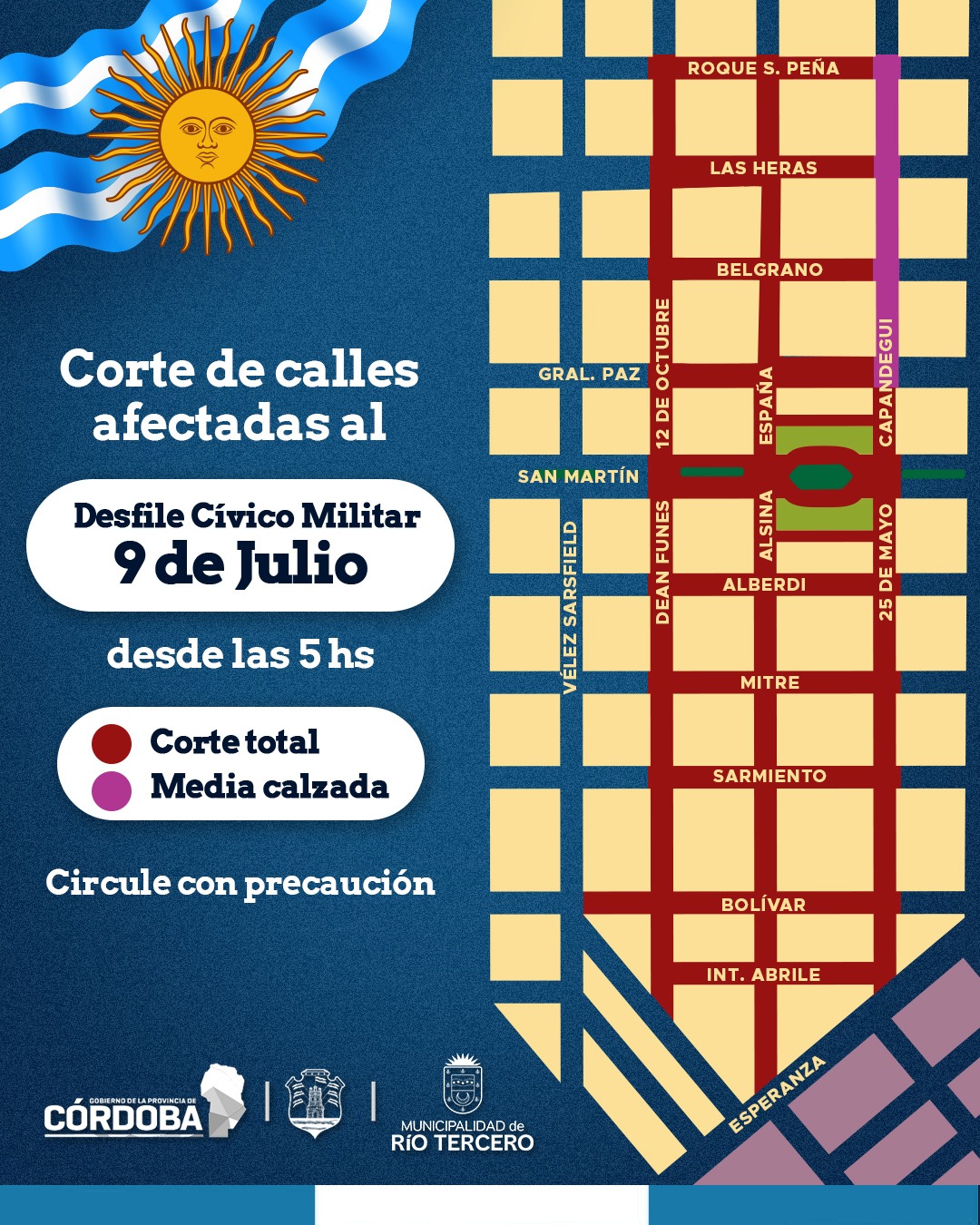 �?“� Mañana martes 9 de Julio, con motivo del acto y desfile cívico-militar por el Día de la Independencia, se realizarán cortes de calle en las siguientes ubicaciones: