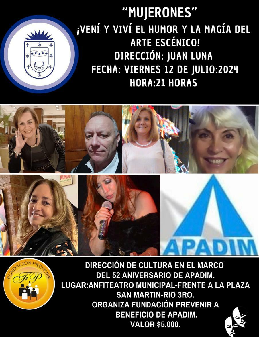 Esta noche y a beneficio de Apadim se pondrá en escena la obra "Mujerones", bajo la producción de la Fundación Prevenir, y contará con la participación de la artista riotercerense. En diálogo con Estación Urbana Farrel señaló que la obra es algo humorística y que "la idea es ayudar a Apadim en el marco de sus 52 años". También comentó que habrá cuatro mujeres y un hombre en escena, señalando que "las mujeres nos vamos a sentir identificadas, los hombres también, con los que nos sucede día a día". El espectáculo tendrá lugar a partir de las 21 en el Anfiteatro Municipal, las puertas se abrirán a las 20.
