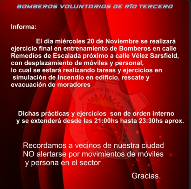El Día miércoles 20 de Noviembre se realizará ejercicio final en entrenamiento de Bomberos en calle Remedios de Escalada próximo a calle Velez Sarsfield, con desplazamiento de móviles y personal, lo cual se estará realizando tareas y ejercicios en simulación de Incendio en edificio, rescate y evacuación de moradores.<br Dichas prácticas y ejercicios son de orden interno y se extenderá desde las 21:00hs hasta 23:30hs aprox.