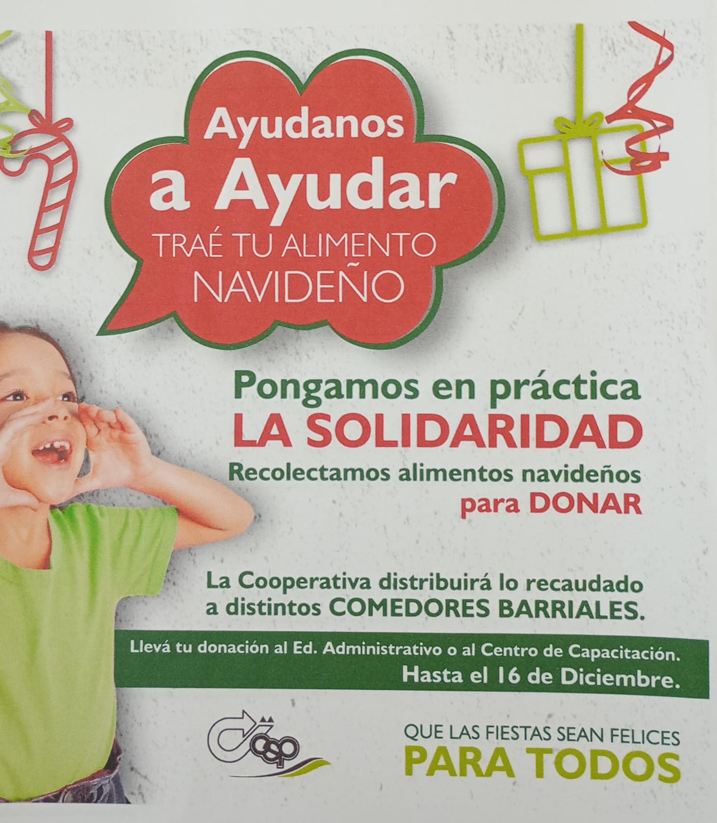 La Cooperativa realiza hasta el 16 de diciembre una colecta de alimentos navideños que luego serán donados a la biblioteca de barrio Parque Monte grande, comedores y merenderos. En diálogo con Silvia Altamirano Consejera de la Cooperativa de Obras y Servicios Públicos y encargada del área Institucionales comentó en Estación Urbana que quienes puedan colaborar con donaciones deberán llevarlas a la Cooperativa o al Centro de capacitación de 7 a 16 hs. Además Altamirano nos informó que el próximo jueves 12 realizarán un evento artistico solidario en donde también recibirán donaciones.