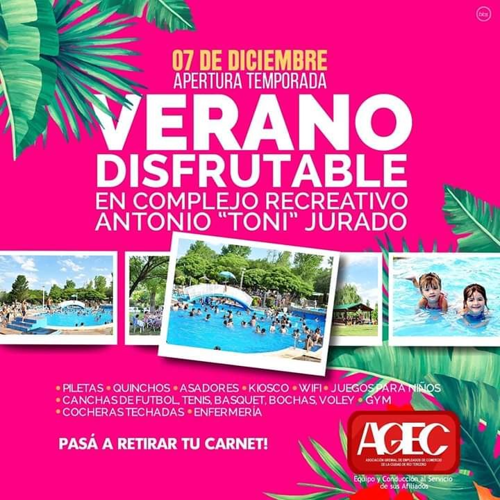 El próximo 7 de Diciembre AGEC te espera en su Complejo Recreativo "Antonio Toni Jurado", todos los días a partir de las 10:00 am espera a sus afiliados y a todo el público en General con un lugar totalmente equipado con asadores, quinchos, kiosco, piletas , gym al aire libre , cocheras , canchas de tenis, fútbol, voley ,bochas, y muchos entretenimientos más.