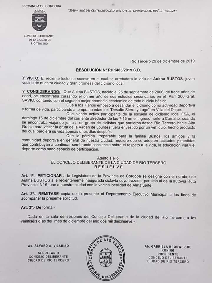 Hoy en el Concejo Deliberante se aprobó por unanimidad un proyecto para solicitarle, formalmente, a la Legislatura de la Provincia de Córdoba designe con el nombre Aukha Bustos a la ciclovía paralela al trazado de la Autovía Ruta Provincial N°6 que une a nuestra ciudad con la vecina localidad d Almafuerte.