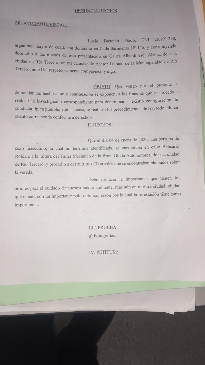 El Asesor Letrado de la Municipalidad de Río Tercero, Facundo Prado presento un pedido en la justicia, ante la Fiscalía de la doctora Paula Bruera para que investigue el daño al arbolado urbano el sábado 4 a las 6:20 que fuera difundido en un vídeo de seguridad por las redes sociales.