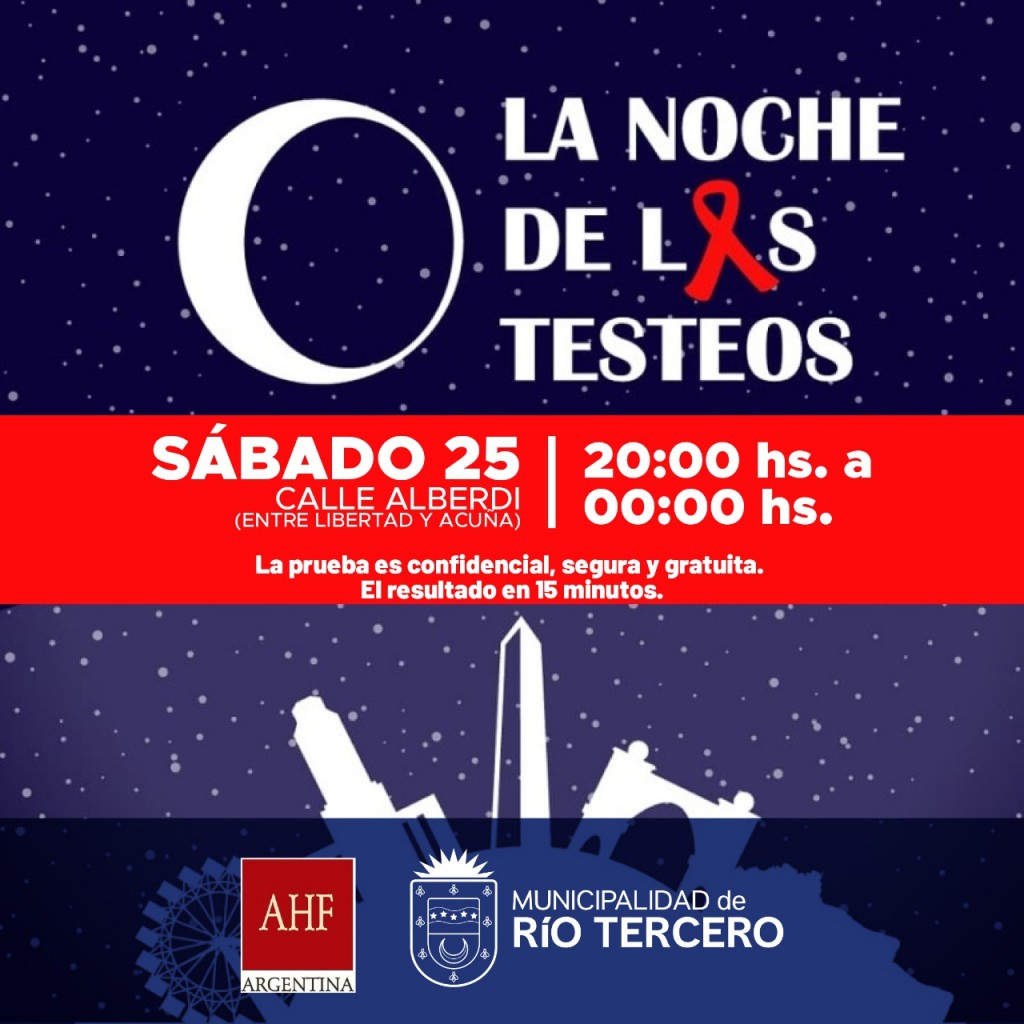 El sábado 25 de enero tendrá lugar la Noche de los Testeos por segundo año consecutivo, donde la Municipalidad de Río Tercero junto a AIDS Healthcare Foundation (AHF) realizarán pruebas gratuitas, seguras y confidenciales de VIH, su resultado se obtiene en 15 minutos.