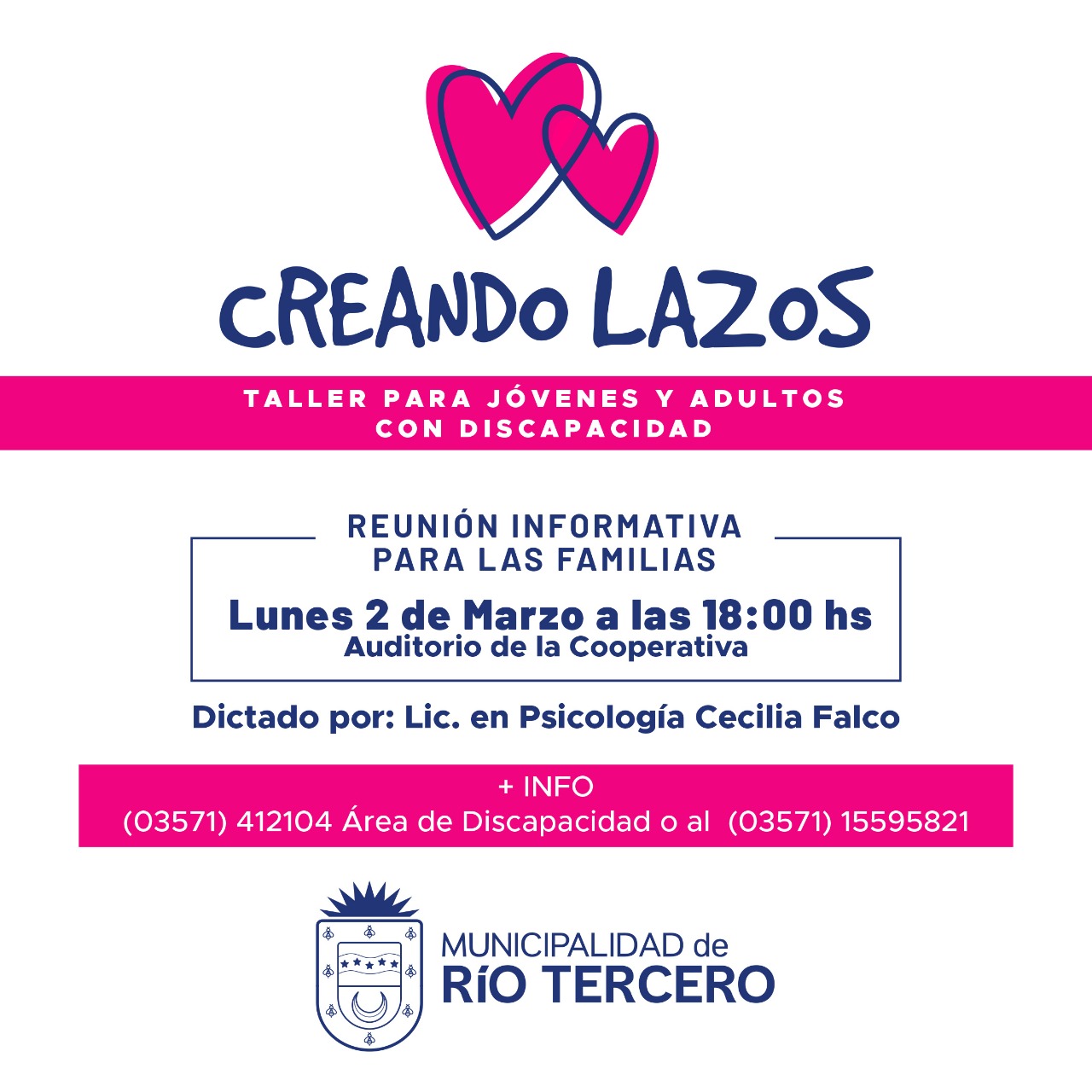 *"CREANDO LAZOS"* es un espacio que se ofrece desde la Municipalida de Río Tercro para jóvenes y adultos con discapacidad con la intención de promover y favorecer la SOCIALIZACIÓN, AUTODETERMINACIÓN E INDEPENDENCIA O AUTOGESTIÓN. A través de talleres vivenciales se promueven actividades relacionadas a la toma de decisiones en la vida cotidiana y su participación en la comunidad, estimulando de esta manera la participación en debates, expresión de emociones, sentimientos y opiniones personales, manifestando intereses y deseos propios.