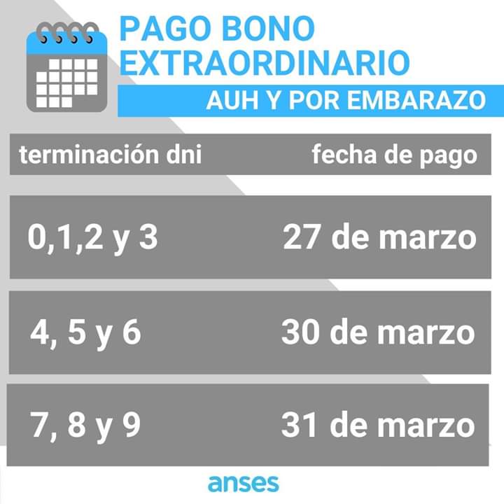 "En la ultima semana de marzo comenzará el pago del bono extraordinario que se otorgará en el marco de las excepcionales medidas sanitarias, laborales y económicas decretadas por el Gobierno", detalló la Anses en un comunicado emitido esta mañana.