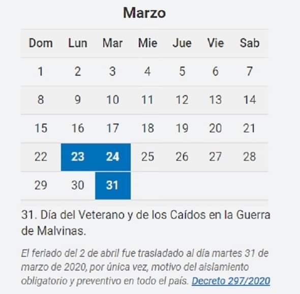 Al anunciar el aislamiento a partir del 20 de marzo, el presidente Alberto Fernández informó que el feriado del 2 de abril por el Día del Veterano y de los Caídos en la Guerra de las Malvinas se adelantaría al martes 31 de marzo.