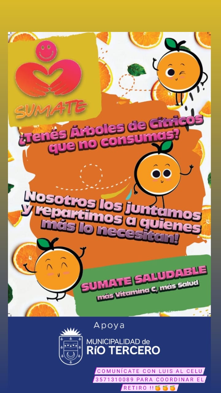 La asociación Sumate lanzó con la colaboración del área de Vecinalismo del municipio, la campaña Sumate Saludable, que tiene las idea de recolectar las frutas de las plantas de cítricos que la gente no consume para distribuirlos en todos los barrios a quienes más lo necesitan. Al respecto hablamos con Luis Giomi, quien adelantó que la idea es distribuir bolsas de uno y dos kilos todos los jueves en distintos puntos de Río Tercero.