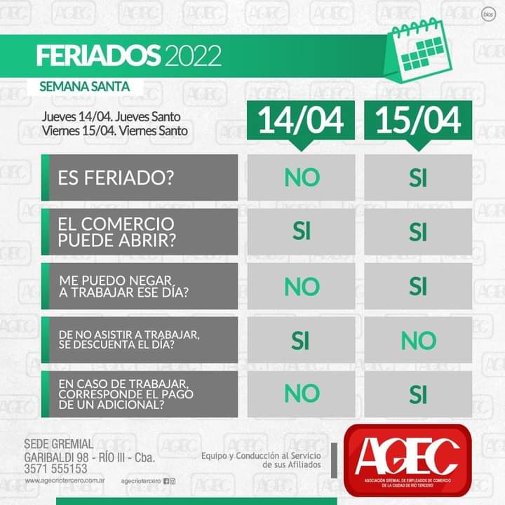 Al explicar la diferencia entre día no laborable y feriado el secretario general de AGEC, José Orlandi, señaló que el jueves "es potestad de la patronal la decisión de trabajar o no y el día se paga de manera normal, pero el viernes es feriado y en caso de trabajar los empleados deben cobrar el día doble" tal lo establece la ley.