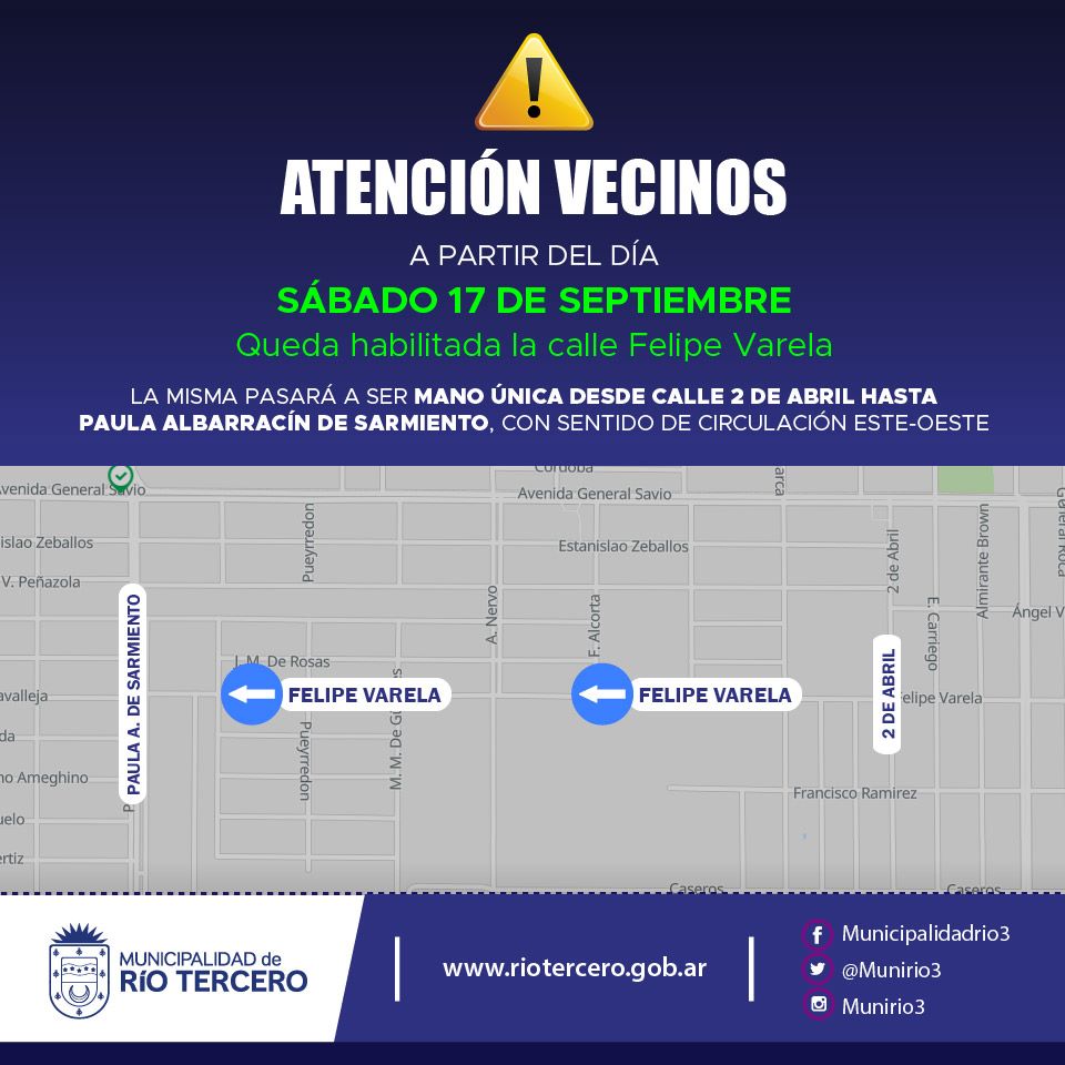 Estuvimos en comunicación con el secretario de Comunicación e Innovación, Emiliano Afara, quien señaló que entra la tarde de hoy y mañana la calle Felipe Varela quedará habilitada al tránsito en el tramo comprendido entre 2 de Abril y avenida de circunvalación Raúl Alfonsín. También Afara señaló que se convertirá en una calle con sentido único de este a oeste, es decir desde barrio Belgrano hacia Montegrande.