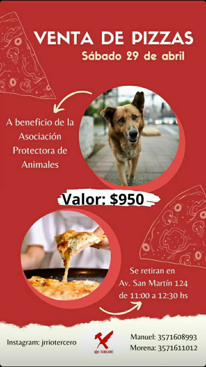 Hablamos al respecto con Manuel Sosa, presidente de la Juventud Radical, quien nos comentó que "es el cuarto año que se hace esta actividad para colaborar con la Protectora, comprando alimento con el dinero que se recauda". La piza tiene un valor de 950 pesos y se puede encargar a través de las redes sociales Facebook e Instagram buscando jrriotercero, o llamando al 3571 608993 hasta el día viernes, y podrán ser retiradas el sábado en San Martín 123.