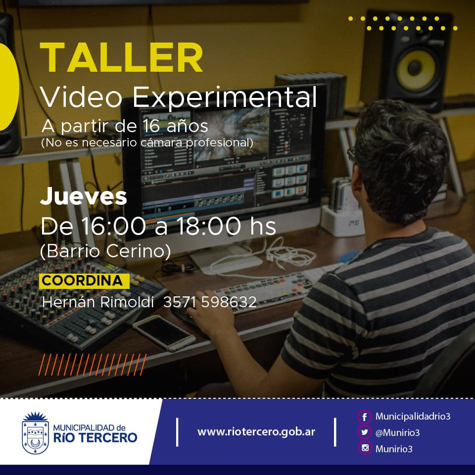 📹 Taller de Video Experimental: (Para mayores de 16 años) 📍En Barrio Cerino: Jueves de 16:00 🕓 a 18:00 hs 🕕 Coordina: Hernán Rimoldi 3571-598632 📌 ▶️ No es necesario cámara profesional Esta iniciativa busca que más riotercerenses tengan la posibilidad del acceso igualitario al ejercicio de los derechos culturales, con el fin de aproximar unos ciudadanos a otros para que puedan compartir con sus pares y crecer tanto personal como colectivamente. 💯 #CulturaRío3