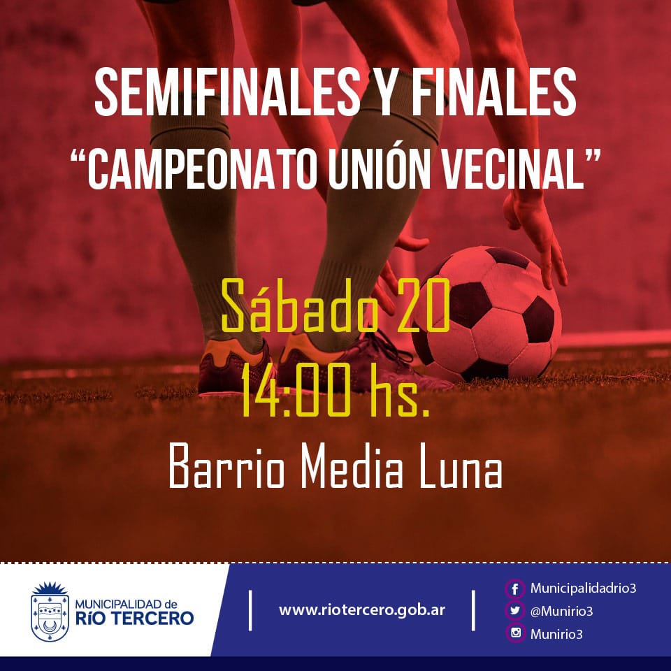 ?‘? Este sábado a partir de las 14:00 hs ?‘ se disputan las semifinales y finales del Campeonato Unión Vecinal de fútbol, en el cual participan las comisiones vecinales de Barrio Media Luna, Sarmiento, Parque Monte Grande, Norte, Magnasco y Monte Grande. ?
