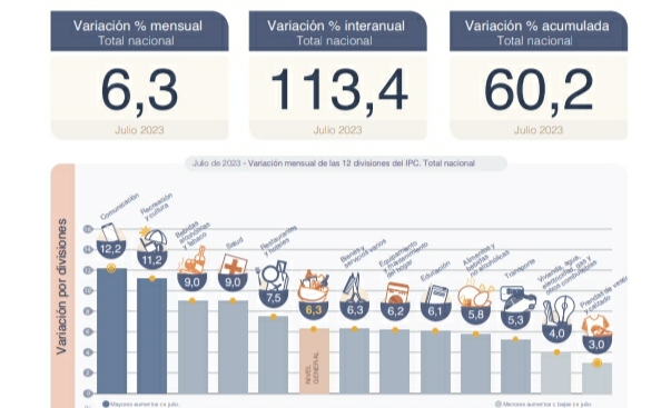 El Nivel general del Índice de precios al consumidor registró un alza mensual de 6,3% en julio de 2023, y acumuló una