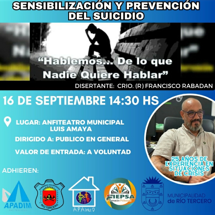 En el marco del "Septiembre Amarillo", tomado a nivel mundial como mes de la prevención del suicidio, se realizará una charla en el anfiteatro municipal que estará a cargo del Comisario retirado Francisco Rabadan y que será abierta a todo público. En diálogo con Mañanas Compartidas, Rabadán habló de la importancia de visibilizar el suicidio y brindó datos alarmantes, como que la franja más afectada por el suicidio es la que va de los 15 a los 29 años a nivel mundial y que además en nuestro país hemos tenido "un aumento alarmante de suicidio infanto juvenil", registrándose en el mundo una muerte por suicidio cada 40 segundos. "Sensibilizar es dar una cachetada de realidad", expresó Rabadan para agregar que hay que desmitificar varias cuestiones y "hay que hablar de suidicio, hay que visibilizar, generar herramientas y generar redes de contención". La charla se dictará este sábado a partir de las 14 30 horas en el Anfiteatro Municipal.