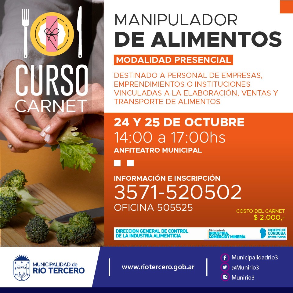 ?… En esta oportunidad el Área de Bromatología llevará a cabo los días 24 y 25 de octubre de 14:00 ?‘ a 17:00 hs ?” en el Anfiteatro Municipal el curso para obtener el Carnet de Manipulador de Alimentos.
