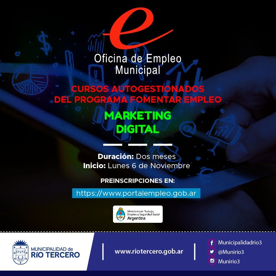 🖥️ Curso de Marketing Digital 📆 Inicio: Lunes 6 de Noviembre ⏳ Duración: Dos meses ▶️ Primero deben ingresar a www.portalempleo.gob.ar y dirigirse a la sección "Soy Ciudadano", posteriormente confirmar la inscripción en la opción "Capacitate". Se recomienda a los y las interesados/as filtrar por localización (Córdoba) y modalidad (Distancia auto asistida). En los primeros días del mes de noviembre les llegará la confirmación de si quedaron inscriptos al curso que se anotaron, recuerden siempre revisar su mail y la bandeja de correos no deseados o spam. También pueden ingresar al portal con su CUIL tanto en usuario y contraseña o con su usuario y clave si es que ya habían realizado otros cursos en formar.gob.ar. ✅ 👉 Para más información y asesoramiento pueden contactarse vía mensajes de WhatsApp (3571-679906) o acercarse a la Oficina de Empleo Municipal, de 07:00 🕖 a 13:30 hs. 🕜 #EmpleoRío3