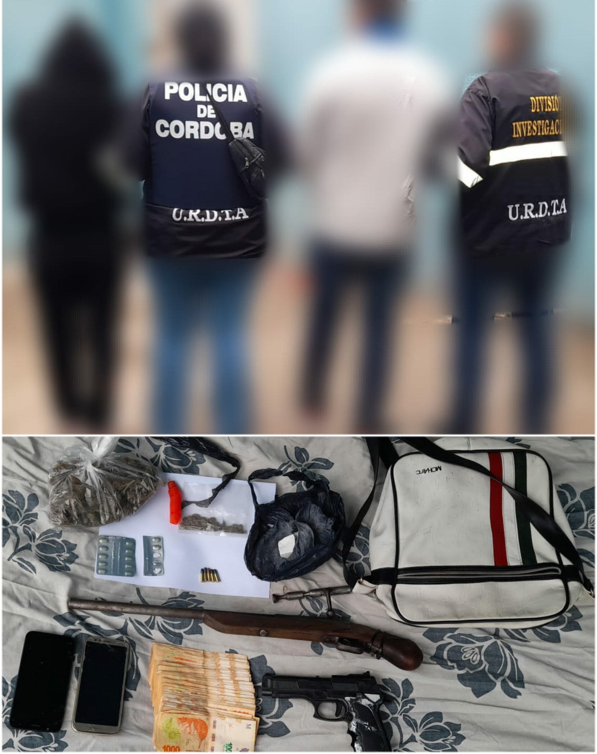 En relación a un hecho delictivo caratulado *AMENAZAS CALIFICADAS*, donde resulta damnificado un joven de 27 años, Personal de la División Investigaciones proceden a cumplimentar *Orden de Allanamiento* en un domicilio de Calle Campichuelo, de Barrio Monte Grande, realizando el *SECUESTRO* de, UNA Carabina recortada, UNA réplica de pistola, Municiones cal. 22, UNA Bandolera, DOS Teléfonos Celulares, 35 gr. de Marihuana, 29 gr. de Clorhidrato Cocaina, 65gr., sustancias de Corte y la suma de $81.000 pesos Argentinos, motivo por el cual procedieron a la *APREHENSIÓN* de los residentes del domicilio, una mujer de 30 años y un hombre de 28 años, *p.s.a. de TENENCIA DE ARMA DE FUEGO, AMENAZAS Y TENENCIA SIMPLE CON FINES DE COMERCIALIZACIÓN*, siendo alojados en el Centro de Contención de la Comisaría local y en la Alcaidía, respectivamente.