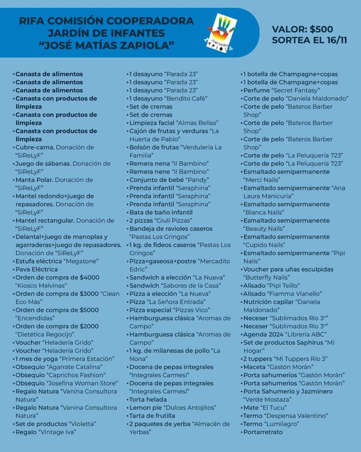 La directora del jardín, Carolina Ragazzini, señaló que "todos los jardines estatales funcionan gracias al aporte de las familias que conforman la comunidad educativa y el mantenimiento edilicio hoy está fortalecido por el trabajo de las cooperadoras escolares". Además habló de la rifa que han organizado y que se sorteará el próximo 16 de noviembre con gran cantidad de premios. Quienes quieran colaborar pueden adquirirlas en el Jardín, ubicado en Diego de Rojas 680 de barrio Escuela.