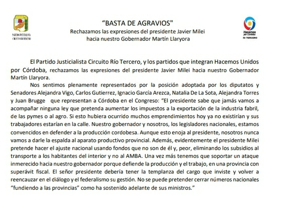 Hablamos al respecto con el presidente del PJ Circuito Río Tercero Yamil Mengo Becil, quien señaló la coincidencia con las expresiones vertidas por los legisladores nacionales por Córdoba rechazando los dichos de Javier Milei contra el gobernador de Córdoba. "Consideramos que los tiempos difíciles que aborda la nación deben ser con diálogo y no con agravios", expresó Mengo Becil y agregó que ven con preocupación "la actitud del gobierno nacional y sobre todo de presidente, que no se condice con su responsabilidad, al referirse a un gobernador que ha sido elegido por su pueblo".