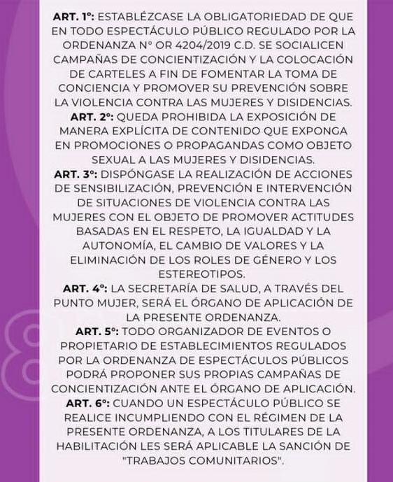 La concejal de Juntos por el Cambio habló del proyecto aprobado la semana pasada, referido a incorporar a la Ordenanza de Espectáculos Públicos la obligatoriedad de realizar campañas de prevención sobre la violencia hacia las mujeres y disidencias y "evitar la cosificación de las mujeres, para que no sean exhibidas como un objeto de atracción sexual". Por otra parte esta semana se trataría otro proyecto relacionado a la prohibición de otorgar subsidios, becas, ayudas económica o de cualquier tipo a quienes tengan condenas por delitos de violencia y abuso.