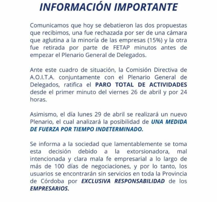 Desde los primeros minutos de este viernes, la Asociación Obrera de la Industria del Transporte Automotor (AOITA), que nuclea a choferes del transporte interurbano de la provincia y también de líneas urbanas de algunas localidades del interior, realizará un paro de 24 horas, frente a la propuesta insatisfactoria de las empresas al reclamo salarial que se viene discutiendo hace más de un mes y medio.