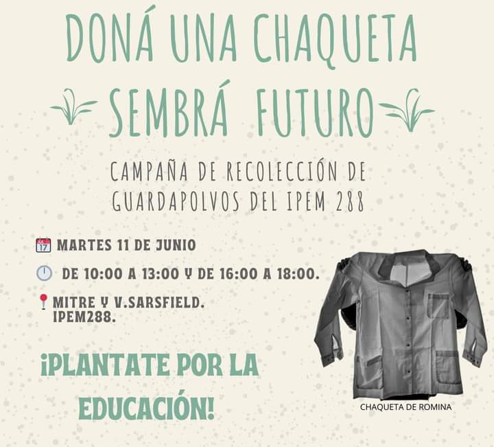 La vice directora de la IPEM 288 "José Hernandez" habló de la actividad "Doná una chaqueta, sembrá futuro" que se desarrollará mañana de 10 a 13 y de 16 a 18 en Mitre y Vélez Sarsfield. "La campaña surge de los estudiantes de sexto año asociados al Centro de Estudiantes, ante la necesidad de usar el uniforme y en el marco de los 75 años de la escuela", expresó Ana Gea y agregó que "la idea es que en un acto de solidaridad ex alumnos o colaboradores puedan donar chaquetas que ya no usan".