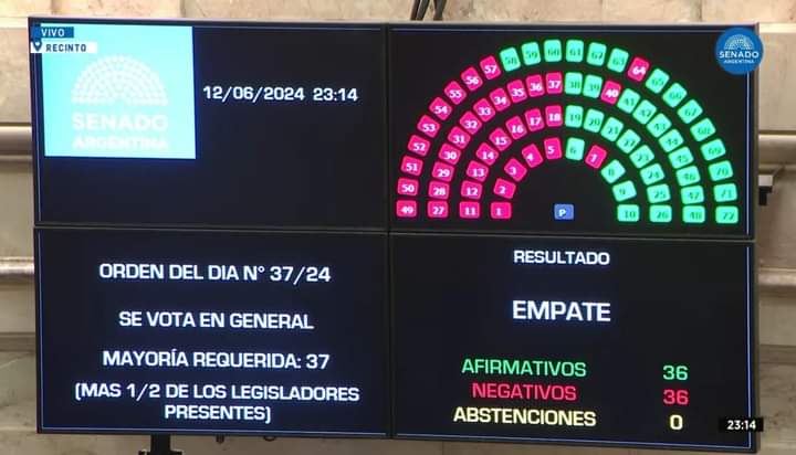 El Senado aprobó esta noche en general la Ley Bases y el capitulo de delegación de facultades al presidente Javier Milei en una ajustadísima votación 36 a 36 que obligó a la vicepresidenta Victoria Villarruel a emitir el voto de desempate. A las 23.16 el recinto de la cámara alta revivió una escena similar a la que protagonizó Julio Cobos en 2008, cuando se trató la Resolución 125. Solo que en esta oportunidad el pronunciamiento fue para alivio del Poder Ejecutivo, que debió aceptar nuevas modificaciones de último momento al dictamen que ya tenia una serie cambios sobre el giro que venía de la Cámara de Diputados. La votación significó un parcial triunfo parlamentario antes de la medianoche y cuando todavía restan varias horas para el tratamiento en particular y el posterior tratamiento del paquete fiscal.