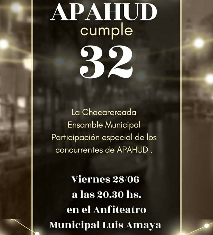 El próximo 26 de junio la institución estará celebrando su cumpleaños número 32 y para festejar tendrán un almuerzo en el que participarán los asistentes, los profesionales e integrantes de la comisión directiva. Así lo comentó la directora del Centro de Día, la licenciada en Psicología Paola Pereyra, quien agradeció a Tiempos de Cambio que "todos los años nos invita a almorzar para festejar". También Pereyra expresó que el viernes 28 se realizará la Noche de Gala a partir de las 20 30 en el Anfiteatro Municipal, donde actuarán la academia La Chacarereada y el Ensamble Municipal y "habrá una sorpresa en formato video preparado por los chicos junto al profesor de Música Adrián González", que posteriormente será subido a las redes sociales de la entidad. Pereyra señaló además que Apahud "está creciendo mucho, tanto en cantidad de asistentes como de profesionales", y agradeció el trabajo del equipo de la entidad y el apoyo permanente de la comunidad.