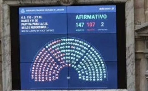 Tras más de doce horas de debate, la Cámara de Diputados dio la última palabra en el prolongado y extenuante trámite legislativo en torno a los proyectos de Ley Bases y el paquete de reformas fiscales con que el presidente de Javier Milei inauguró su mandato. Con una mayoría contundente gracias al apoyo de los bloques de oposición dialoguista, la Ley Bases se aprobó con 147 votos positivos y 107 negativos, estos últimos de Unión por la Patria y de la izquierda. Otros dos diputados se abstuvieron.