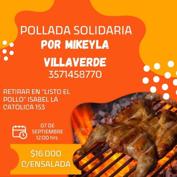 Al respecto hablamos con su papá, Diego Villaverde, quien comentó que contra todo pronóstico la pequeña continúa "avanzando muy bien" y si un centro local la admite volverían a la ciudad para que inicie su tratamiento a partir del próximo lunes. Teniendo en cuenta el costo de los medicamentos y las terapias la familia necesita contar con dinero para solventar los gastos hasta tanto la obra social realice la cobertura necesaria, y por eso se organiza una pollada para el fin de semana. Los pollos con ensalada pueden reservarse hasta el miércoles y ser retirados el sábado en Listo el Pollo (Isabel La Católica 153), y deben llamar al 3571 458770.