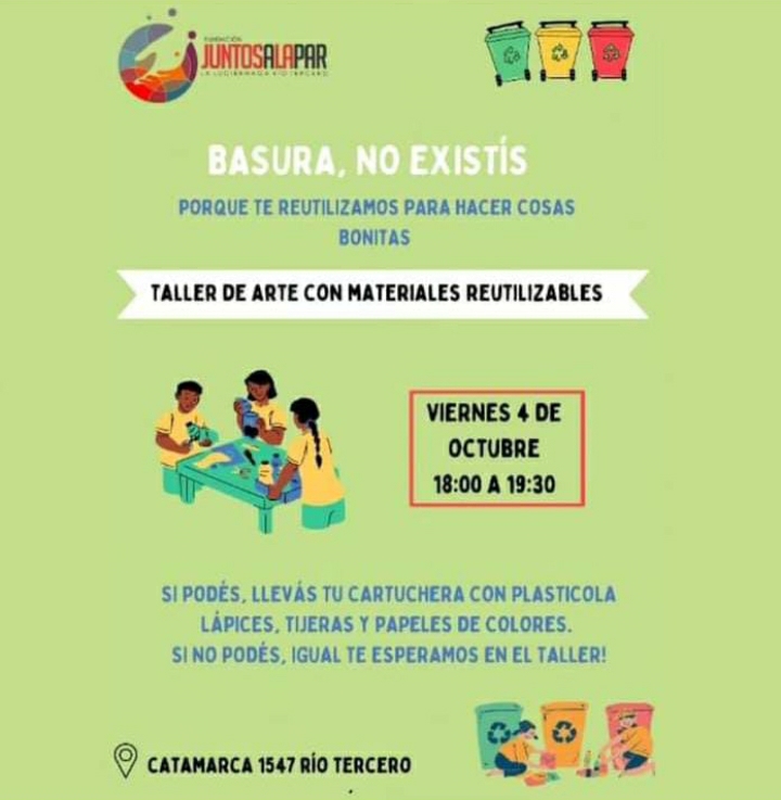 Está destinado no sólo a los niños que concurren a las clases de Apoyo Escolar sino a todos los niños de la ciudad y se realizará desde las 18 a las 19 30 en Catamarca 1547, en la Casa de La Luciérnaga. "La idea es que cada fin de semana los niños tengan actividad recreativa distinta", expresó Cristina Mecatti, integrante de la Fundación Juntos a la Par, agregando que esta tarde trabajarán con materiales reciclables para hacer un presente para el Día de la Madre. También señaló que si algún integrante de la comunidad quiere colaborar puede hacerlo con temperas, plasticolas, lápices y o papeles de colores y tijeritas.