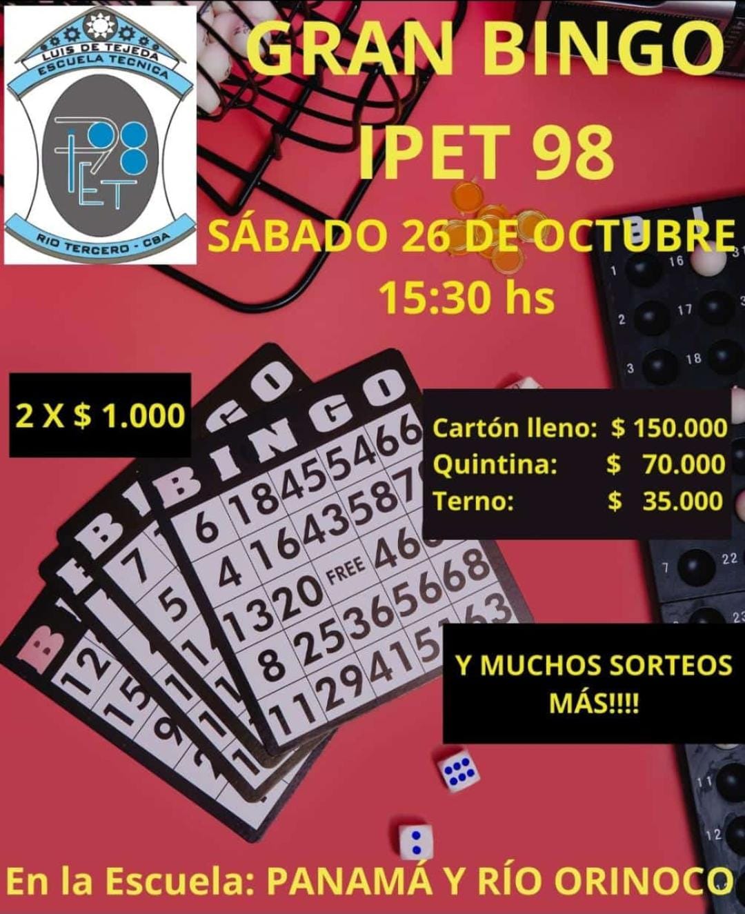 El próximo 26 de octubre y con 260 mil pesos en premios la IPET 98 realizará un gran Bingo, con la intención de recaudar fondos para el recambio de los pizarrones. La directora de la institución, Alejandra Rosa, señaló que desde la comunidad educativa y en conjunto con la Cooperadora "se trabaja con la idea de que los estudiantes tengan una mejor calidad educativa, mejorando el ambiente en el que se trabajan valores como el cuidado y el respeto".