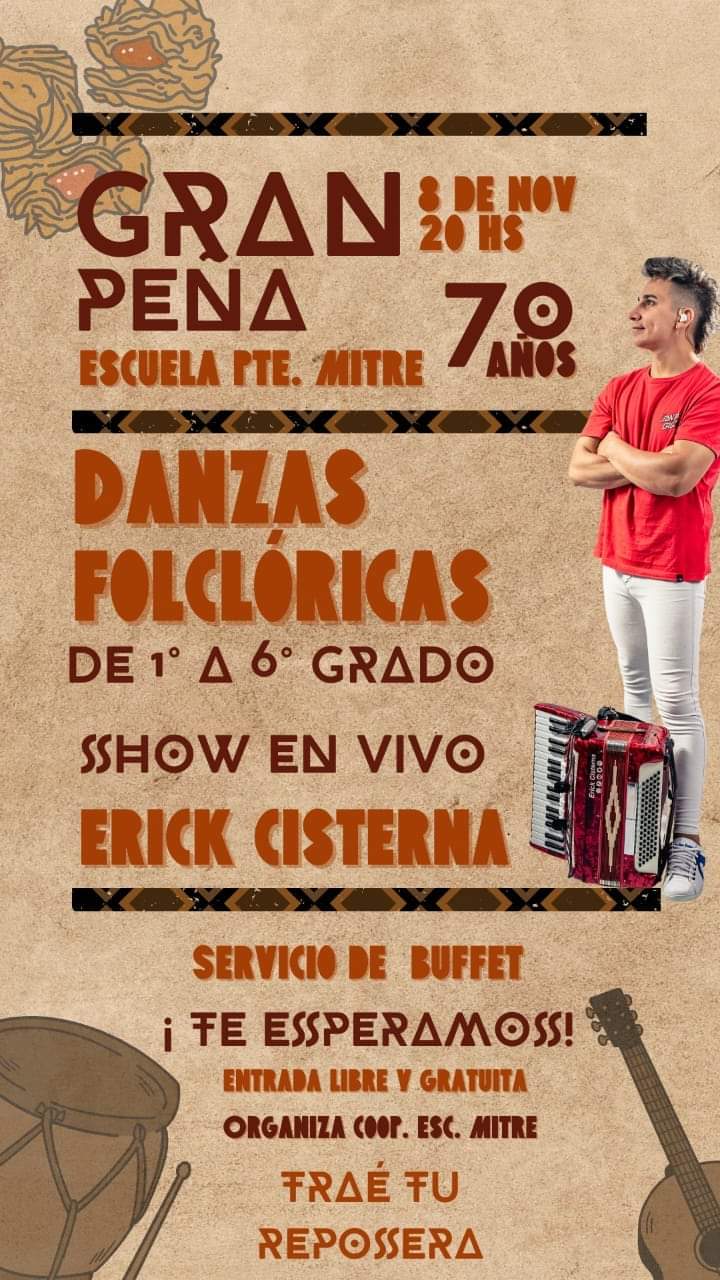 La directora de la Escuela Presidente Mitre señaló a Estación Urbana que mañana se realizará la Gran Peña 70 años, que dará comienzo a las 20 y se realizará en el patio de la institución educativa. Está prevista para la peña la actuación de las 12 secciones del establecimiento con doce danzas folclóricas con la guía del Programa Folclorito.