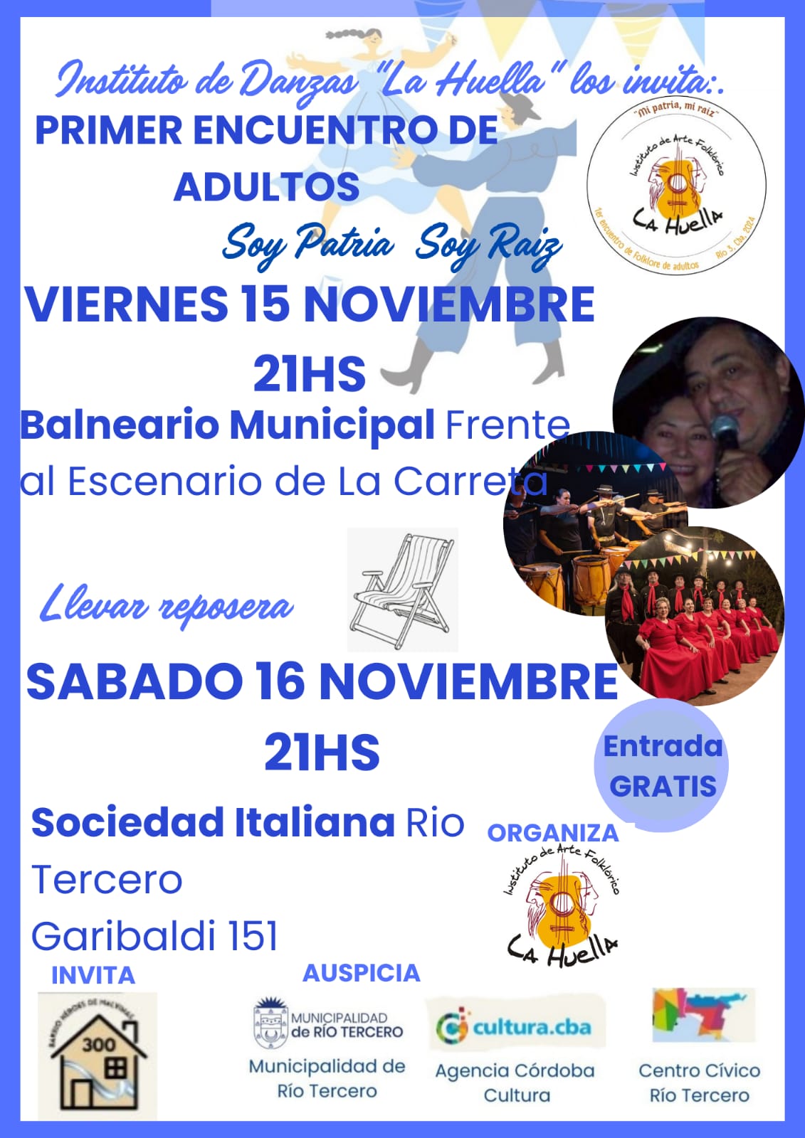 Al referirse a la realización del Primer Encuentro de Adultos "Soy Patria, Soy Raíz", el director de la Academia "La Huella" expresó además que la idea del mismo también es "dar ejemplo a las nuevas generaciones de cómo se cuida la tradición principalmente a través de la danza". Con una gran grilla de grupos folclóricos musicales y academias de Danzas el viernes se llenará de vida el escenario del Balneario Municipal a partir se las 21, brindando además a quienes acudan un buffet criollo con locro, empanadas y choripan, con entrada libre y gratuita. Al día siguiente se dará continuidad a la celebración de la Tradición en la Sociedad Italiana con la Peña "Malvinas en Celeste y Blanco", en un trabajo conjunto con la comisión vecinal del barrio Héroes de Malvinas, también con entrada libre y gratuita.