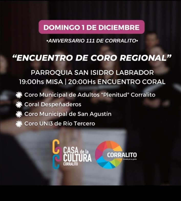 Hablamos al respecto con el intendente Gonzalo Querro, quien señaló que a las19 está prevista la misa y a las 20 un "Encuentro de Coro Regional", en el que participarán el Coro Municipal de Adultos "Plenitud" de Corralito, el Coro de Despeñaderos, el Coro Municipal de San Agustín y el Coro de la UNI3 de Río Tercero. También Querro indicó que hoy se realizará el cierre de las actividades de la Casa de la Cultura a partir se las 20 30 horas. Por otra parte Querro habló de la continuidad de las obras en la localidad, destacando que está próxima a inaugurarse la Casa Rincón de Luz para personas con Discapacidad.